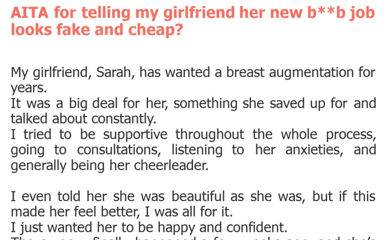 Oh, relationships. They're a delicate dance of honesty, support, and sometimes, biting your tongue. Today's AITA story throws us right into the deep end of this complex interplay, tackling a topic many find intensely personal and fraught with emotion: cosmetic surgery. It's one thing to have an opinion, but it's another entirely to vocalize it, especially when it concerns your partner's body and their choices. \n Our storyteller, let's call him OP, finds himself in hot water after offering his unfiltered thoughts on his girlfriend's recent breast augmentation. This isn't just about aesthetics; it's about trust, vulnerability, and the unspoken rules of partnership. So, buckle up, because this one is sure to ignite some fiery debate about where the line between brutal honesty and outright cruelty truly lies.