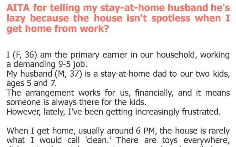 AITA for telling my stay-at-home husband he’s lazy because the house isn’t spotless when I get home from work?