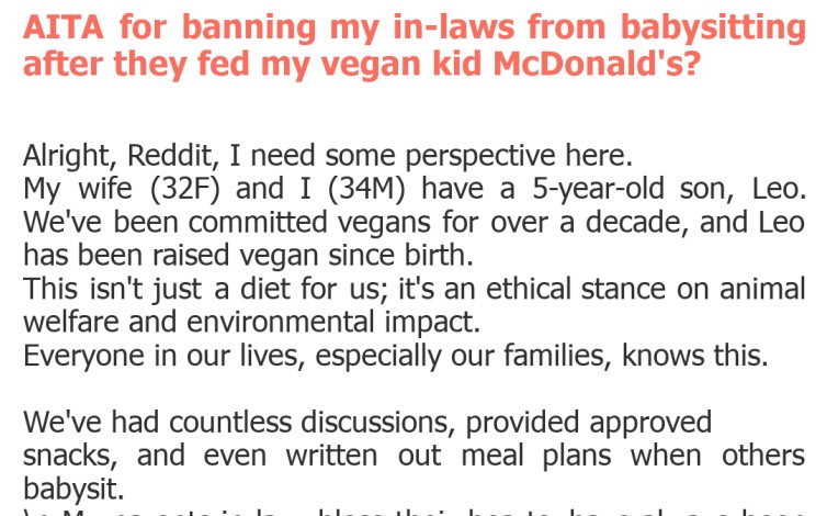 "AITA for banning my in-laws from babysitting after they fed my vegan kid McDonald's?"