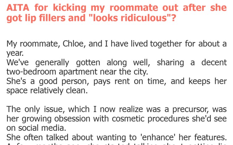 Welcome back, dear readers, to another deep dive into the unpredictable world of shared living! Today’s dilemma hits a nerve, pitting personal aesthetic choices against the comforts of home. What happens when a roommate's transformation pushes boundaries so far that cohabitation becomes unbearable? It's a tricky balance between respecting individual freedom and maintaining peace in your shared sanctuary. This story serves as a stark reminder of how quickly personal judgments can escalate.\nOur OP faces just such a predicament after their roommate decided to get lip fillers, leading to a dramatic and immediate fallout. The confrontation wasn't just about an appearance; it was about trust, respect, and the very definition of a comfortable living space. Was OP justified in their drastic action, or did they cross a line? Let's unpack this intense tale and see if the internet's verdict aligns with your own.