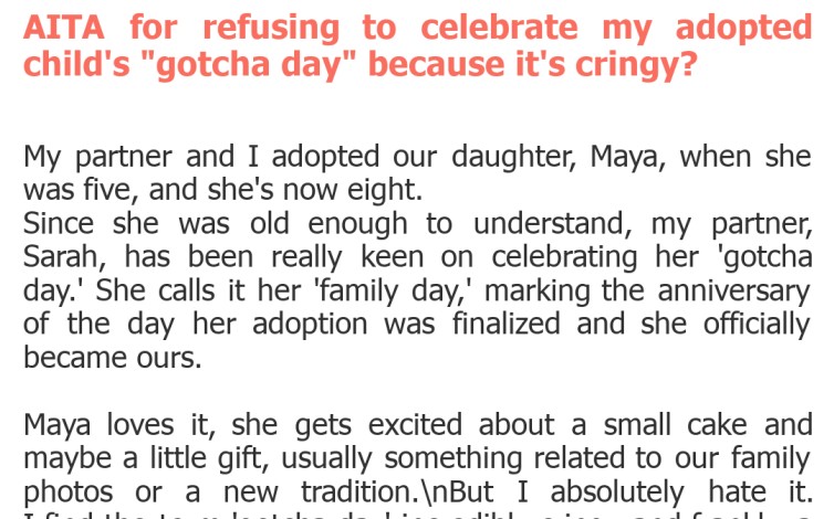 This post highlights a genuine tension many adoptive families face. On one hand, the desire to celebrate an adoption day, often called a 'gotcha day' or 'family day,' comes from a place of deep love and the wish to affirm a child's belonging. For many children, especially those adopted later in life, this day can be a significant marker of stability and joy, a celebration of their new beginning with their forever family, helping to build a positive narrative around their adoption story.\nHowever, the poster's discomfort with the term 'gotcha day' is also understandable. The phrasing can indeed feel somewhat infantilizing or reminiscent of 'catching' a pet, which doesn't sit well with everyone. The underlying sentiment is usually pure, but the optics and language can be jarring. It's a valid personal preference to dislike the terminology, and the poster is expressing an authentic feeling, even if it's perceived as insensitive by their partner.\nThe core conflict here isn't just about terminology; it's about whose feelings take precedence. The partner argues it's for Maya's benefit and joy, emphasizing the child's positive reception of the celebration. The poster, conversely, is projecting potential future embarrassment onto Maya, while also prioritizing their own discomfort in the present. This creates a difficult emotional landscape where both parents feel they are acting in the child's best interest, albeit from different perspectives.\nUltimately, finding a middle ground that honors Maya's feelings and the significance of her adoption, while also acknowledging the poster's discomfort, is crucial. Dismissing a celebration that brings joy to a child, especially an adopted child who might benefit from extra affirmation, could inadvertently send a message of devaluation. Conversely, forcing a parent to participate in something they genuinely find 'cringy' without discussion can breed resentment. Communication and compromise are key to navigating these sensitive family dynamics.