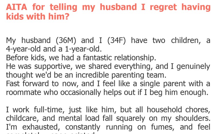 On one hand, OP's feelings of regret are valid, stemming from a perceived lack of partnership and support. Her statement, while incredibly harsh, seems to be a desperate cry for help and acknowledgment of her suffering. It's not about regretting her children, but regretting the *dynamic* and the *choice of partner* for this monumental life stage. When someone is pushed to the brink, their words can often be unfiltered and painful, reflecting deep-seated frustration rather than pure malice.