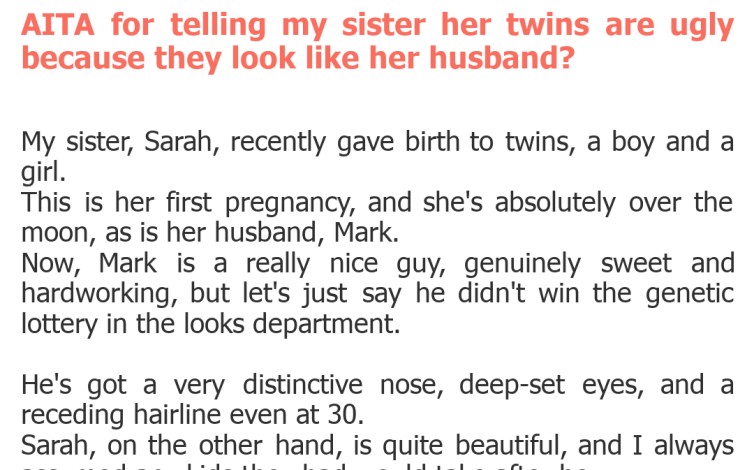"AITA for telling my sister her twins are ugly because they look like her husband?"