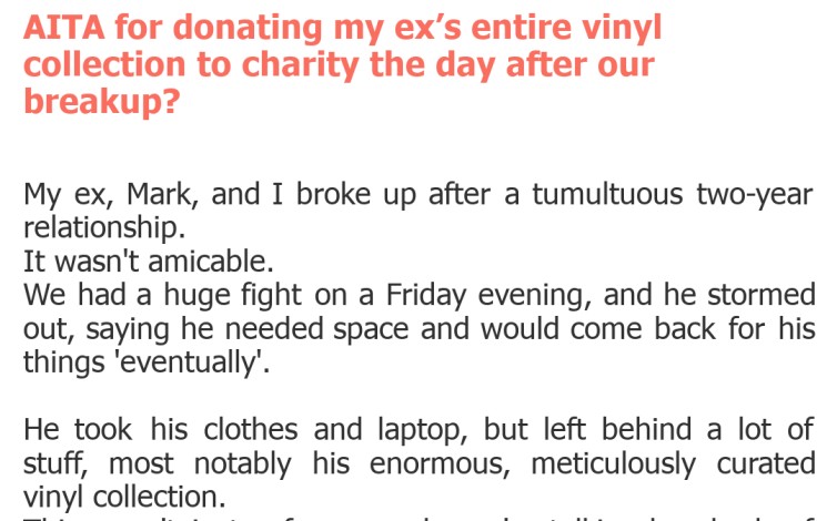 AITA for donating my ex’s entire vinyl collection to charity the day after our breakup?