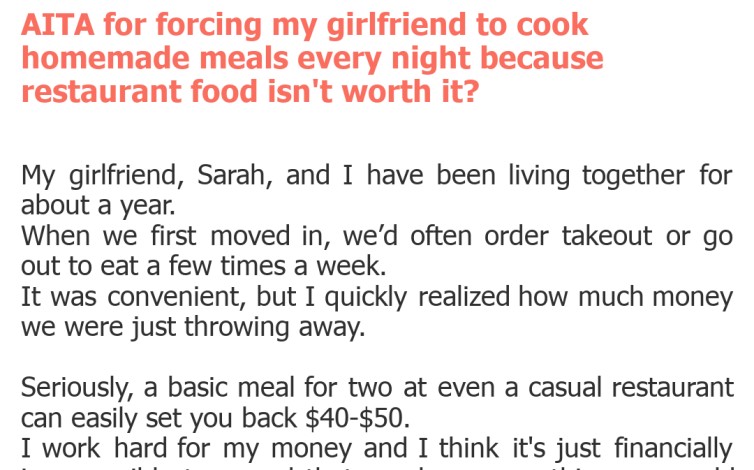 "AITA for forcing my girlfriend to cook homemade meals every night because restaurant food isn't worth it?"