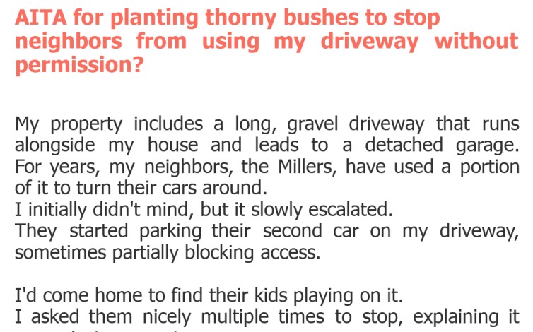 "AITA for planting thorny bushes to stop neighbors from using my driveway without permission?"