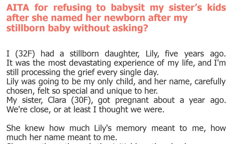 AITA for refusing to babysit my sister’s kids after she named her newborn after my stillborn baby without asking?