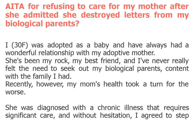 "AITA for refusing to care for my mother after she admitted she destroyed letters from my biological parents?"