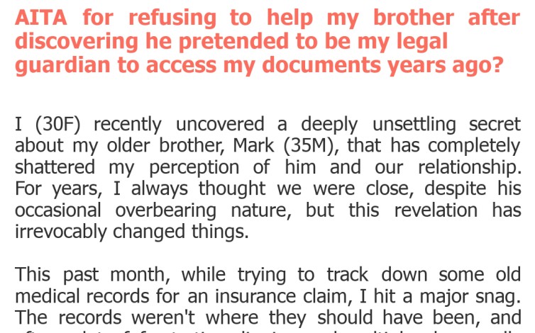 This particular AITA submission really makes you question where the line is drawn when family crosses boundaries. What happens when a secret from years ago, involving a blatant breach of trust and potentially illegal actions, comes to light? Our OP discovered their brother wasn't just nosey, but actively impersonated a legal guardian to access personal documents. Now, the brother needs help, and OP is left to decide whether to extend a hand to someone who so deeply wronged them.