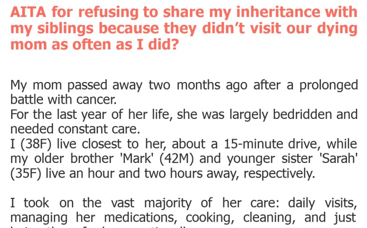 "AITA for refusing to share my inheritance with my siblings because they didn’t visit our dying mom as often as I did?"