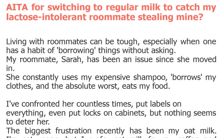 Our original poster, let's call them OP, has a roommate with a known penchant for pilfering. The twist? The roommate is lactose intolerant, and OP's usual oat milk keeps disappearing. So, OP devised a plan that some might call genius, others might call diabolical. Get ready for a story that's sure to spark some strong opinions!