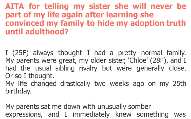 OP's reaction, while extreme in cutting off her sister, is an understandable expression of profound hurt and anger. Her sense of identity has been rocked, and the foundation of trust with her sister has crumbled. Whether cutting off Chloe permanently is the right long-term solution is debatable, but in the immediate aftermath of such a revelation, it's a raw, visceral response to what feels like a fundamental violation of her personal truth and agency. She needs time and space to process this.