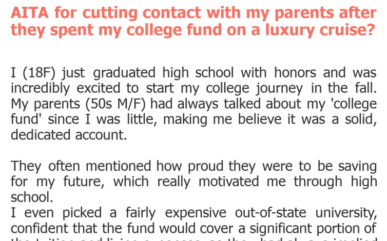 "AITA for cutting contact with my parents after they spent my college fund on a luxury cruise?"