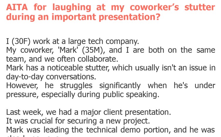 "AITA for laughing at my coworker’s stutter during an important presentation?"