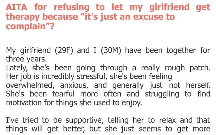 "AITA for refusing to let my girlfriend get therapy because “it’s just an excuse to complain”?"