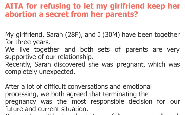 "AITA for refusing to let my girlfriend keep her abortion a secret from her parents?"