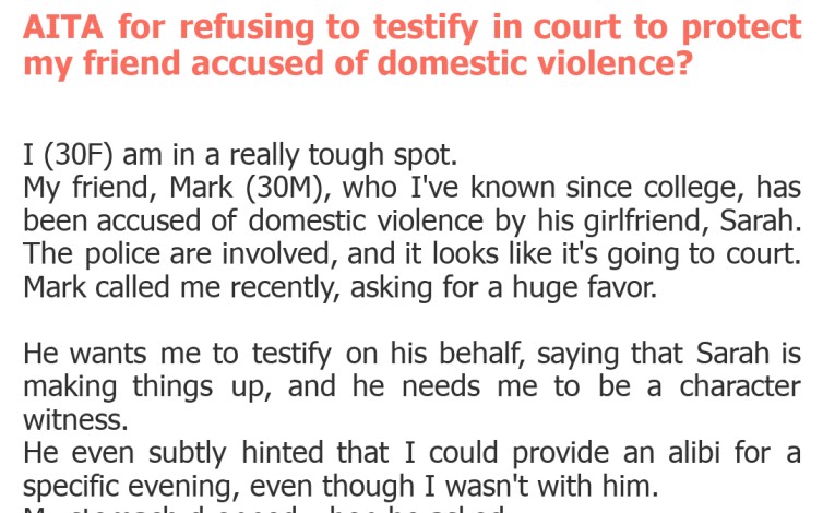 "AITA for refusing to testify in court to protect my friend accused of domestic violence?"