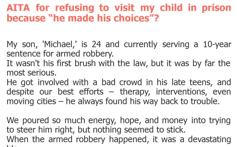 "AITA for refusing to visit my child in prison because “he made his choices”?"