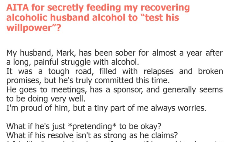 "AITA for secretly feeding my recovering alcoholic husband alcohol to “test his willpower”?"
