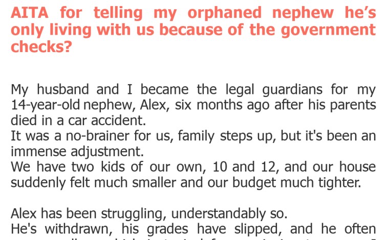 "AITA for telling my orphaned nephew he’s only living with us because of the government checks?"