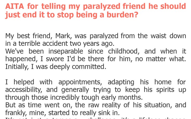 "AITA for telling my paralyzed friend he should just end it to stop being a burden?"