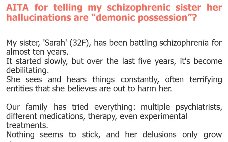 "AITA for telling my schizophrenic sister her hallucinations are “demonic possession”?"