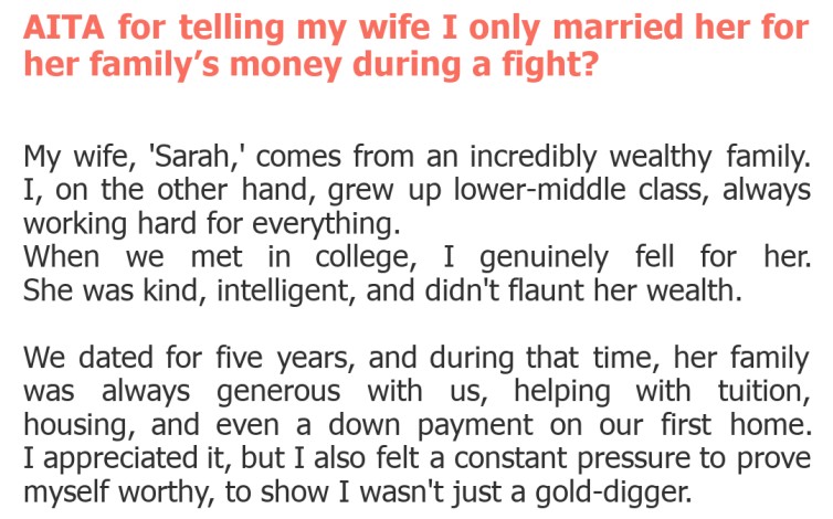 "AITA for telling my wife I only married her for her family’s money during a fight?"