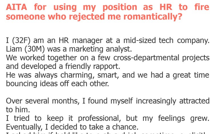 "AITA for using my position as HR to fire someone who rejected me romantically?"