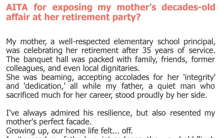 "AITA for exposing my mother’s decades-old affair at her retirement party?"