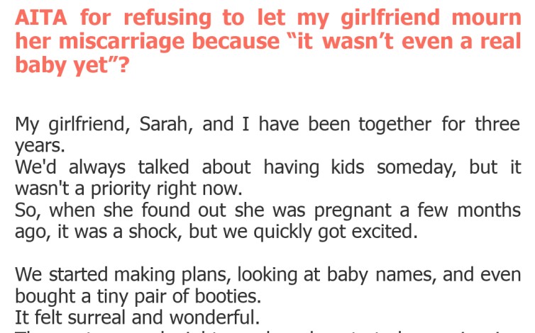 "AITA for refusing to let my girlfriend mourn her miscarriage because “it wasn’t even a real baby yet”?"