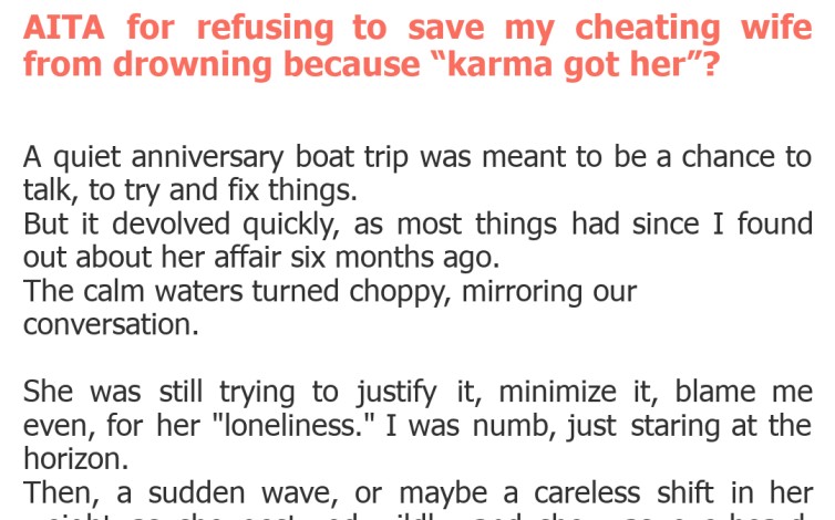 "AITA for refusing to save my cheating wife from drowning because “karma got her”?"