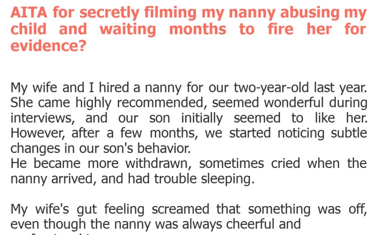 "AITA for secretly filming my nanny abusing my child and waiting months to fire her for evidence?"