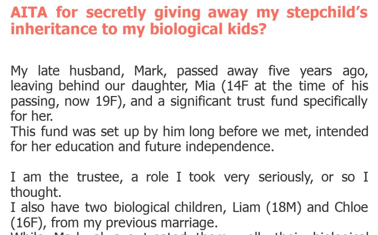 "AITA for secretly giving away my stepchild’s inheritance to my biological kids?"