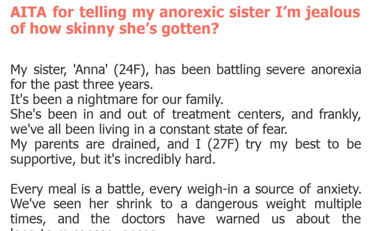 "AITA for telling my anorexic sister I’m jealous of how skinny she’s gotten?"