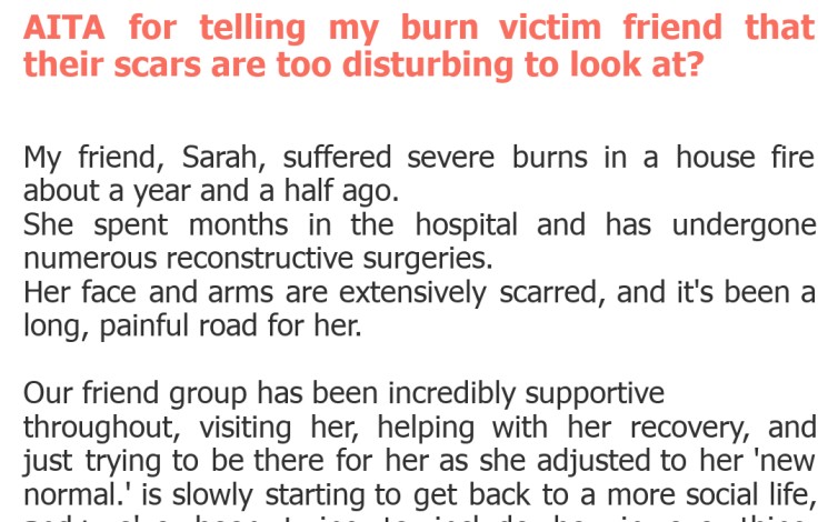"AITA for telling my burn victim friend that their scars are too disturbing to look at?"