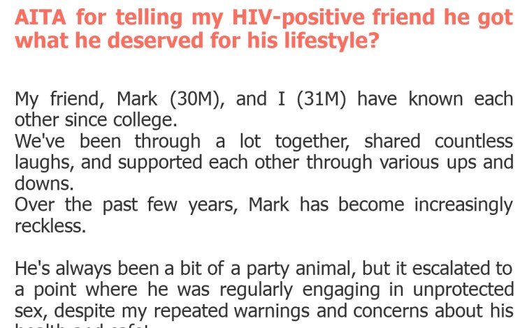 "AITA for telling my HIV-positive friend he got what he deserved for his lifestyle?"