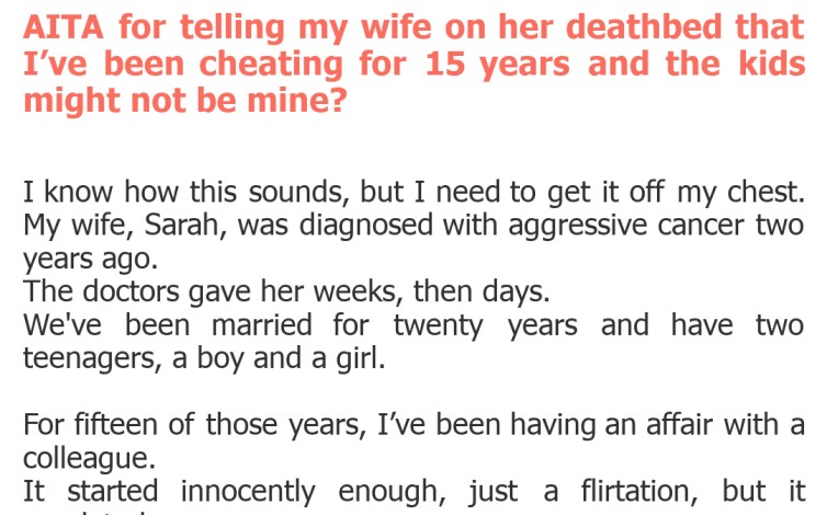 "AITA for telling my wife on her deathbed that I’ve been cheating for 15 years and the kids might not be mine?"