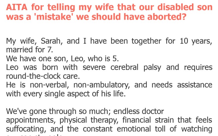 "AITA for telling my wife that our disabled son was a 'mistake' we should have aborted?"