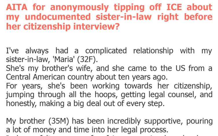 "AITA for anonymously tipping off ICE about my undocumented sister-in-law right before her citizenship interview?"