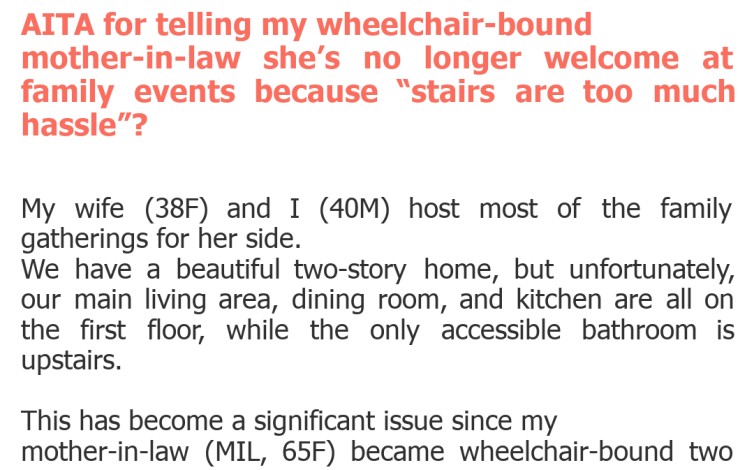 "AITA for telling my wheelchair-bound mother-in-law she’s no longer welcome at family events because “stairs are too much hassle”?"