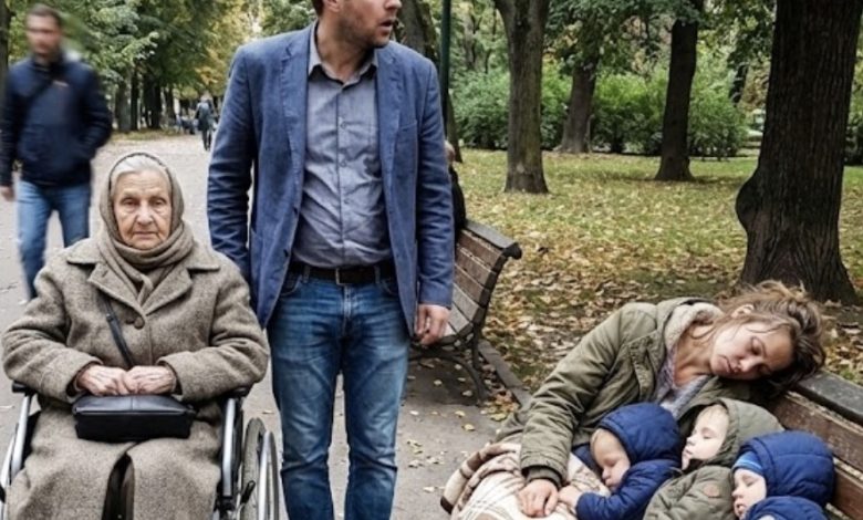 A wealthy man took his mother for a quiet walk through the park—then froze when he noticed his ex-wife asleep on a bench… with three babies beside her.