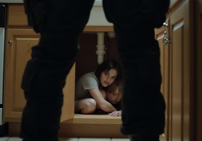 Emily didn’t wait for me to decide. She pulled me toward the kitchen. I followed without thinking. We squeezed into the cupboard under the sink, our knees pressing into bottles and pipes. The sharp smell of cleaning chemicals filled my nose as I pulled the door shut, leaving only a small crack.