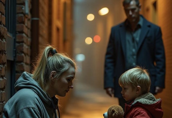 The song was barely louder than the wind, fragile and thin, but it carried a familiar rhythm. Leo stopped completely. A few steps away, near a closed shop with metal shutters, a woman sat hunched beside an old stroller. Her blonde hair was messy, tied back loosely, strands sticking to her face. She wore a coat that was far too big, its sleeves frayed and worn. Her hands, red from the cold, gently adjusted a blanket inside the stroller.