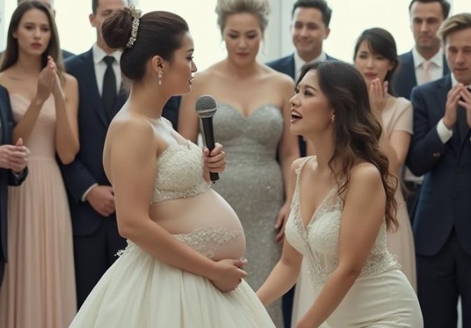 My sister showed up to my wedding dressed like she was the bride. A huge white gown, shining under the lights like a crystal chandelier. Then she grabbed the microphone and announced, smiling proudly, “I’m pregnant with twins!” The room exploded in cheers. My mother cried with happiness. My wedding disappeared behind her drama. When I tried to stop her, she shoved me, and my parents rushed to protect her. So I stayed silent… until it was my turn. I calmly took the microphone back and said, “Since secrets are being shared today…”