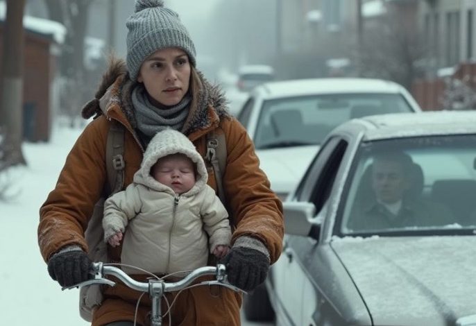 I climbed into the warmth of the car, Noah pressed close. Heated air wrapped around us, smelling of leather and something expensive. The bicycle remained in the snow, abandoned like an earlier version of myself. My eyes burned.