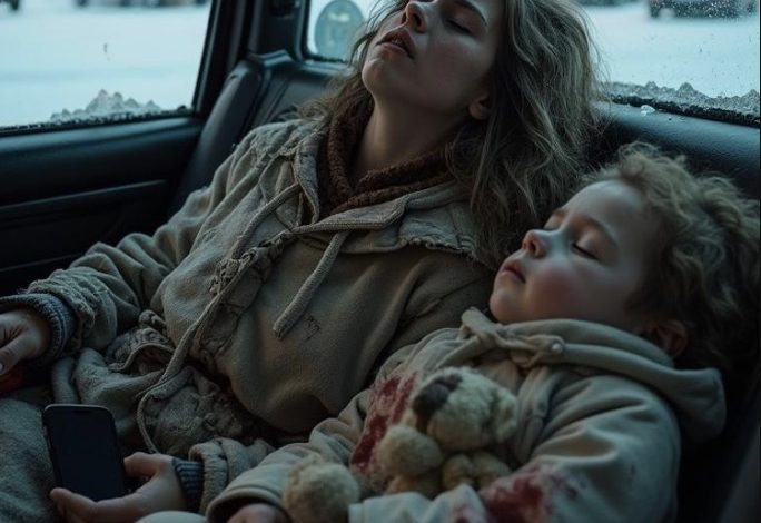 In the back seat, under a single thin blanket, her three-year-old twins—Noah and Nora—were asleep, curled into each other, their small breaths fogging the air.