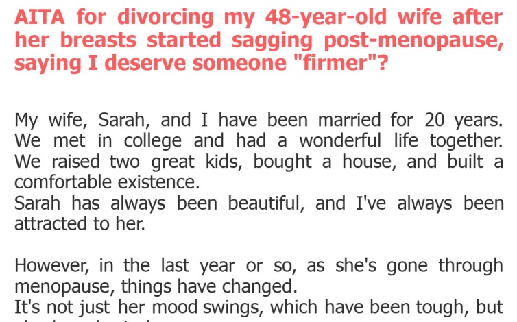 "AITA for divorcing my 48-year-old wife after her breasts started sagging post-menopause, saying I deserve someone "firmer"?"