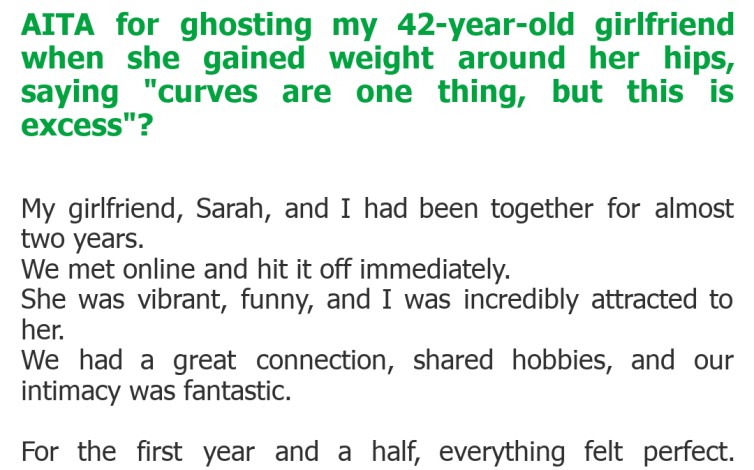 "AITA for ghosting my 42-year-old girlfriend when she gained weight around her hips, saying "curves are one thing, but this is excess"?"