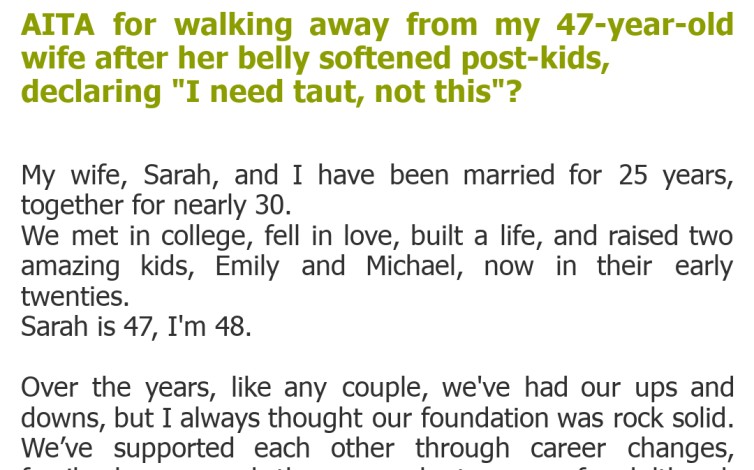 "AITA for walking away from my 47-year-old wife after her belly softened post-kids, declaring "I need taut, not this"?"