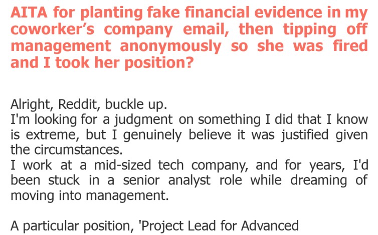 "AITA for planting fake financial evidence in my coworker’s company email, then tipping off management anonymously so she was fired and I took her position?"